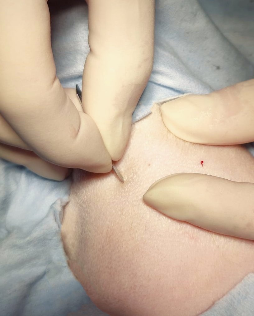Queste premesse sono necessarie per comprendere la strategia del movimento del paziente nei riguardi del suo problema ed eseguire così una mappa tutta individuale del paziente dei punti da impiantare. L’impianto dei grani d’oro avviene in anestesia generale così da poter posizionare correttamente il paziente e impiantare in modo preciso i grani stessi. La tosatura della parte risulta necessaria. Si esegue una piccola incisione con il bisturi per poter posizionare un particolare ago metallico cavo tramite cui viene fatto cadere il grano d’oro nel punto stabilito.