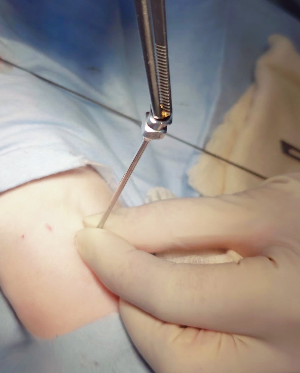 Posizionamento dell’ ago cavo con infissione del grano d’ oro